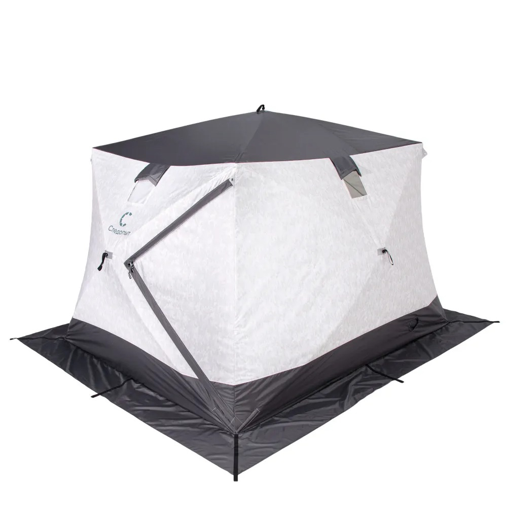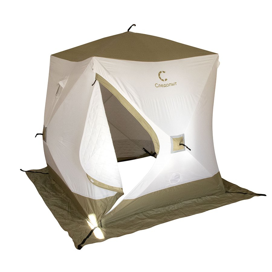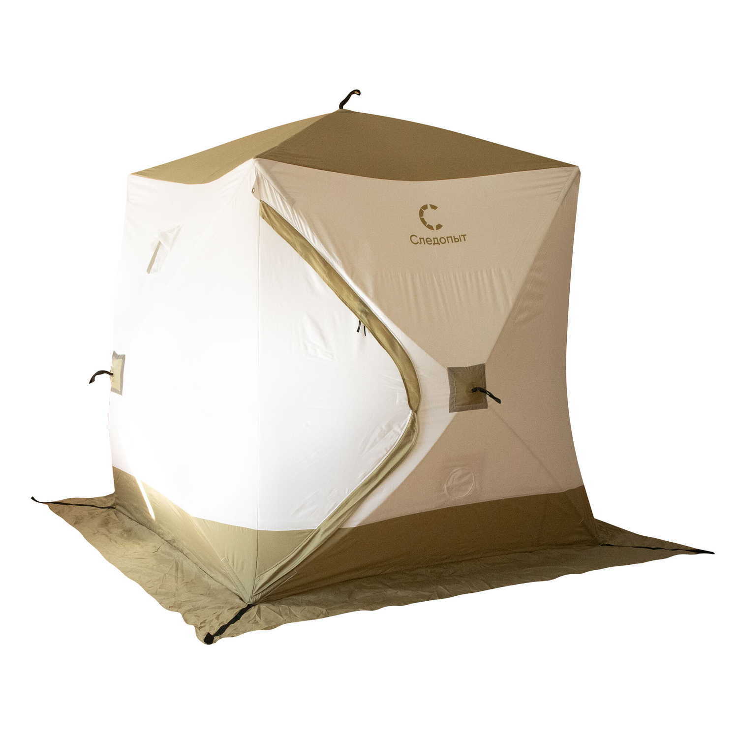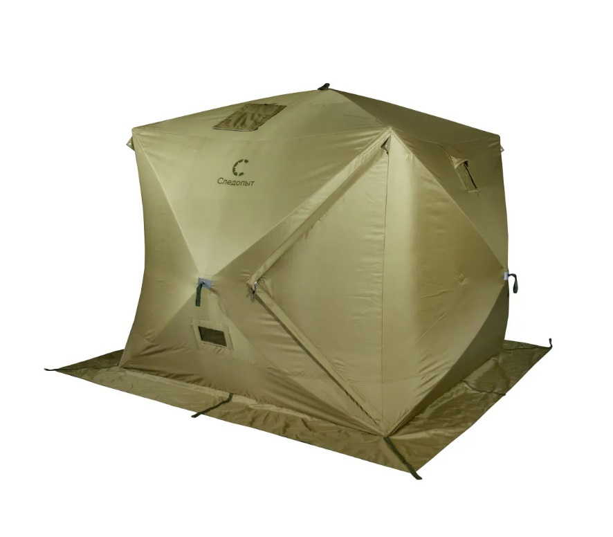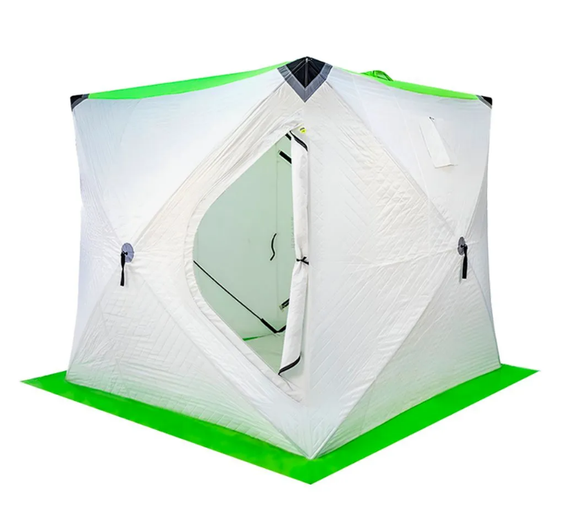 Палатка зимняя «Следопыт «Куб» «Premium» с 2 входами. Каркас палатки сделан из стеклопластикового прутка d 10 мм, который скреплен хабом (материал Полиамид РА-6). Верхняя ткань Oxford дублируется с подкладочной тканью (термостежка подкладка 190Т + синтепо