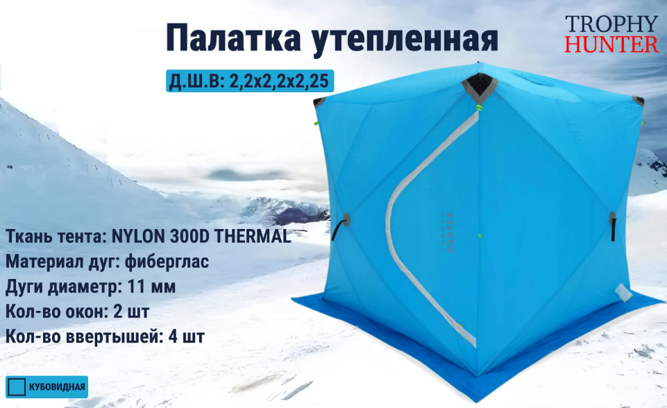 Палатка зимняя Куб "Улов" предназначена для зимней рыбалки, позволяющая рыболову чувствовать себя максимально комфортно на зимней рыбалке в любых погодных условиях. Палатка обеспечивает защиту от ветра, дождя и низких температур, а продуманная конструкция